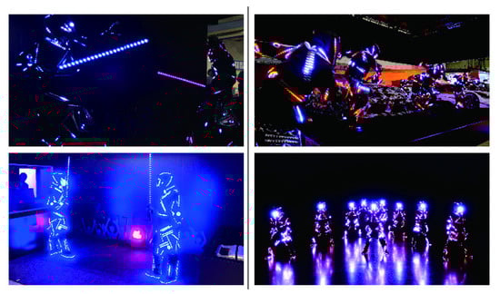 We conducted two dance performances using the LED costume base on our design guidelines introduced in Section 8. These dance performances are shown in Figure 14. In the Digital Contents EXPO 2018 [39], held in Japan in October, we conducted a special dance performance that imitates fencing jointly with Dai Nippon Printing. There were two dancers, and they wore an LED mask and held an LED sword reminiscent of fencing. There were one or two technical staff members including the operator. This performance time was approximately 3 min and conducted 3 times per day for 3 days, and the LEDs on the costumes did not break. At the OSAKA AUTO MESSE 2019 [40] and TOKYO AUTO SALON 2019 [41], Japanese car exhibitions held in January and February 2019, respectively, we conducted special dance performances as a part of the advertising of a new sports car at the TOYOTA GAZO RACING booth. There were ten dancers, and the performance included by a powerful dance with a sense of running. There were two or three technical staff members including the operator. The performance time was approximately 3 min, and was performed 4 or 5 times per day for 6 days. Some LED units got fractures because of the powerful dance. Since only a few LED units were fractured per day, they could be repaired by one staff member. The main cause of failure was that the LED units peeled off from the polycarbonate plate. From these two performances, the number of broken LED has decreased. Due to the little breakage, we could reduce the number of staff members to repair the broken LEDs and maintain the costume, reducing cost.
