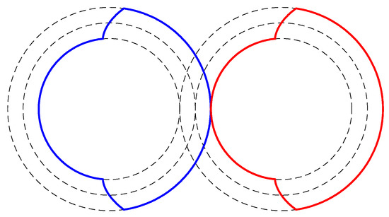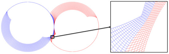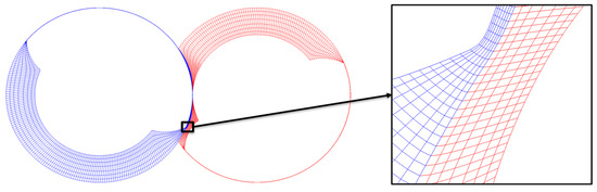 The twin-screw vacuum pump profile used for the analysis is shown in Figure 3. The rotor profile is symmetric and equal for both rotors formed of just one lobe on each rotor. The rotor lobe is formed by two circular arcs representing the inner and outer rotor diameters and the involute curve forming the rotor flute.