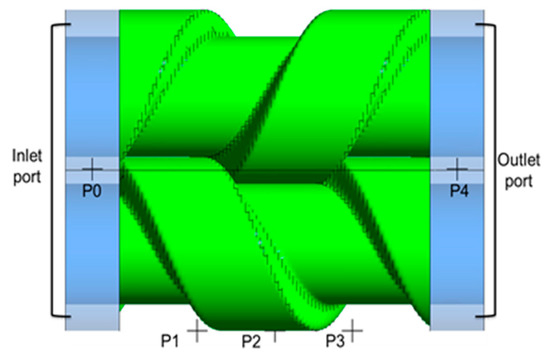 In this section, CFD simulation results are presented in the form of pressure-angle diagram, torque distribution, power and mass flow rate. Five monitoring points were positioned along the Z-axis to measure the pressure variation in the chamber as shown in Figure 4. Figure 11 shows the pressure contours for one time step with −0.5 bar(g) inlet pressure. The pressure changes gradually from the inlet to the outlet side.