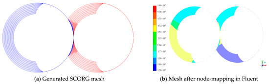 Figure 10a shows one slice of a 2D mesh generated for the single lobed twin-screw pump, this mesh is then loaded into Fluent as customised grid. Fluent is an unstructured solver where node numbers are updated when the mesh is loaded. With the customised grid (before node mapping), node numbering starts from the inner boundary and increases with radial coordinates. However, with this customised grid (before node mapping), mismatch occurs between node numbers in Fluent and SCORGTM. With mismatch in node numbers, the translation of node positions with marching time steps cannot be continued and therefore the node mapping procedure needs to be performed. After the node mapping, the node numbers will be matched between SCORGTM mesh and mesh in Fluent. This variation in node numbers on a plane rather than being radially distributed is shown in Figure 10b. This Figure 10b shows that the node mapping has been achieved and the grid can be taken forward for flow calculations. Finally, with marching in time, the x, y and z positions of the node are updated for the complete operational cycle.