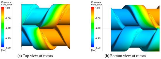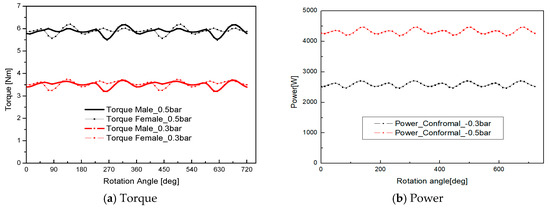 The torque on each rotor was calculated from the CFD results using surface pressure as shown in Figure 14a. The torque distributed on the main rotor and gate rotor are almost same because they have the same rotor profile. The average torque on the main rotor with −0.5 bar(g) inlet pressure is 5.88 while the average torque with −0.3 bar(g) is 3.54 .