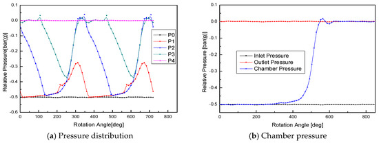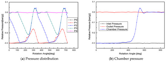 Figure 12 shows the variation of pressure in the chamber with inlet pressure −0.5 bar(g) at 3500 rpm. As shown in Figure 12a, points P0 and P4 show the inlet pressure −0.5 bar(g) and outlet pressure 0 bar(g). Additionally, the pressure in the inlet port and outlet port is relatively steady. By connecting the pressure of P1, P2 and P3 monitor points, the pressure-angle diagram can be generated as shown in Figure 12b. Due to the configuration of ports, this pump has only external compression. The pressure increase in the chamber is caused by the leakage from the high-pressure side to the low-pressure side. It can be noticed in Figure 12b that discharge pressure is not higher than atmospheric pressure as the outlet port is fully open. Additionally, Figure 12 indicates that the pressure fluctuation near the outlet port is relatively small.