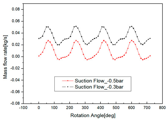 Variation of mass flow rate with rotation angle is shown in Figure 15. The average suction mass flow rate for −0.5 bar(g) is 0.0083 kg/s and −0.3 bar(g) is 0.034 kg/s.