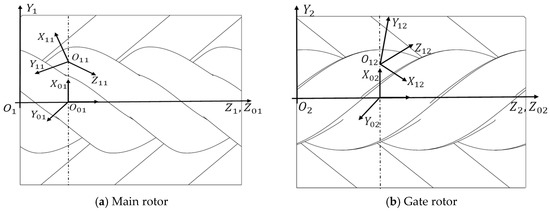 Each desired cross section on the main rotor is defined with the local transverse coordinate system . That system rotates for the helix angle and transforms along the -axis of the main rotor coordinate system. The gate rotor transverse coordinate system rotates with the gate rotor helix angle and transforms along the -axis of the gate rotor coordinate system .
