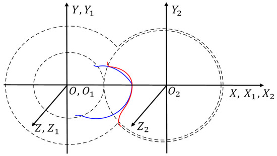 The gate rotor normal coordinate system is defined as , as shown in Figure 17b. The axis is tangent to the helix line in the origin . The origins go along with the pitch helix line. The gate rotor normal profile is defined in this coordinate system.