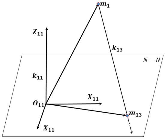 The normal rack can be obtained by projecting every point of the transverse rack from the transverse plane to the defined normal planes. Figure 20 demonstrates the method of projecting one random rack point to a plane to get the point in the plane . The point value can be calculated by the equation . Then the coordinate of the point can be obtained.