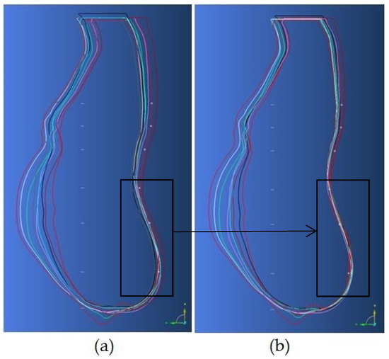 Afterward, each body was symmetrically divided into left and right parts through the spine line and all the spine lines were extracted to be compared. The spine lines positions were modified according to the reference scanned body (16th week) to facilitate the analysis of body evolution. All the spine lines positions have been adjusted considering the points under the bust, belly and waist. These three points were chosen for spine adjustment due to the observable form of the body around them. The spine lines position is depicted before and after adjustment in Figure 3a,b. As illustrated in Figure 3b, the evolution of the body is clear after the spinal adjustment.