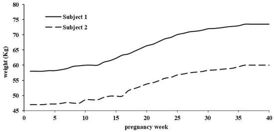 The weight gain graph (2) of the scanned pregnant women (Subjects 1 and 2).