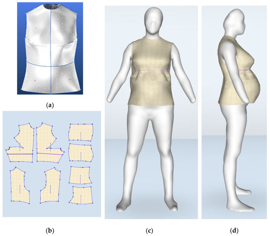 The final garment block pattern and the corresponding virtual try-on result are represented in Figure 11b–d. As can be seen, the block pattern with armpit darts suggested the appropriate fit on the pregnant virtual mannequin (subject 2). Characteristics of the formerly manufactured fabric were assigned to the design pieces to virtually try on the developed garment block pattern on the body. It should be noted that the thickness of the produced fabric for electromagnetic shielding clothing in our previous work was 3.37 mm and the areal density was 0.136 g/cm2 while the woven fabric was made of cotton yarns and hybrid conductive yarns (consist of PA6, 6, carbon black and multiwall carbon nanotube).