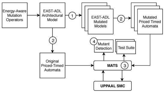 - EAST-ADL to PTA Transformation. The second step (described in detail in Section 3.2) is used for transforming the EAST-ADL model to PTA. The output of this step are PTA models containing the original structure and behavior of the EAST-ADL together with all inserted mutants and annotated with energy consumption information to be used by UPPAAL SMC for test-case generation and selection.