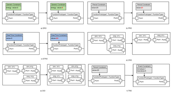 - Functional Architecture Structure (i.e., Component Removal Operator (cro), Component Insertion Operator (cio), and Triggering Pattern Replacement Operator (tro)). We change the architectural elements in EAST-ADL by removing or inserting components that influence the energy consumption as well as modifying the triggering of each component.