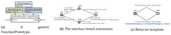 At each level of abstraction, the model is composed using components (i.e., FunctionType) which describe the functionality of the system. Each FunctionType contains: (i) Ports that receive and provide data, (ii) a trigger (i.e., time-based or event-based), and (iii) an internal behavior. Each of these components is instantiated as a FunctionPrototype. The execution of each FunctionPrototype uses the “read-execute-write” semantics, and the internal behavior is defined using different languages (e.g., Simulink, UML, UPPAAL PORT timed automata [19,20]). In this study we use the models at the design level, containing the Functional Design Architecture (FDA) and Hardware Design Architecture (HDA) annotated with non-functional properties. The design model can be annotated with a GenericConstraint property representing the energy utilization.