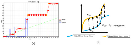 To exemplify this step, we show an example of a test suite that detects a mutant if the energy signal varies significantly from the expected energy values at certain time points (as shown in Figure 4b). In practice, we use a quantitative measure of mutant detection to measure the mutant-revealing capability of a test suite. Let a test case TC be created for a mutated system model M, and let be the set of energy signals generated by simulating M for the inputs in TC and sampled at N time points. Let be the corresponding expected energy signals. We use a threshold to verify if the distance is greater than this threshold between each value of and at each time point. If there is at least one energy value in for which the distance is greater than the expected threshold, we say that we can detect the mutant M. Otherwise, the injected fault is not detected by TC.