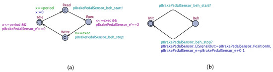 To exemplify the transformation of the BBW system modeled in EAST-ADL, we show a small-case example in Figure 6 that depicts the translation of the brake pedal sensor FunctionPrototype into a network of two synchronized PTA. For each component, the energy is calculated according to the rate of consumption monitored in the interface PTA (), and a constant value is used in the behavior automaton (). The energy consumed by the entire system is computed using the sum of the energy consumed by each component.