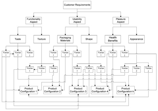 Problems arising from the increase of product variation include how to satisfy the wants and needs of customers through the appropriate product design. An important aspect of MC is the engagement of the end consumer in product design before it is produced [17]. The essential MC philosophy involves the customer in the pre-manufacturing design of a product; the customer is not really involved in the design but simply states his or her preferences [18]. According to [17,18], there are two aspects of product design in MC, namely sensory performance and functional performance. Sensory performance is associated with appearance (fashion, design, color), sound (programming on an iPod), or the taste and aroma of food. Functional performance is related to various aspects of performance, such as speed, power, and handling of cars, screen size, and computer memory capacity. Product design in the food industry is related to not only sensory but also functional performance, so it will involve very diverse consumer preferences related to not only taste and aroma but also color, texture, and even the nutritional value of the food product, which is a functional performance.