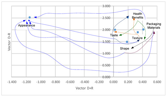 With regard to the importance values of each attribute, the taste attribute had the highest importance value, equal to 42.899, followed by the attributes of appearance, shape, texture, health benefits, and packaging materials. The taste attribute was the most important attribute for ice-cream products, which is in line with the opinion of [51], who stated that the taste attribute is the key driver for consumer preferences. Similarly, [52] agreed that for the food and beverage industry, the attributes of flavors (taste) and fragrances are especially important.