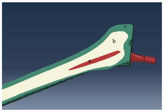 The structure of the bone and implant: (a) implant, (b) cancellous bone, and (c) cortical bone.
