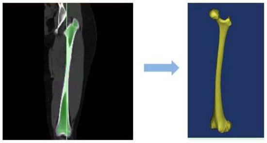 A series of 2D computed tomography (CT) image slices of the femoral bone of a 28-year old male is used to rebuild the target area (see Figure 2). In this respect, a total of 251 images with 355 pixels × 251 pixels and a spatial resolution of 0.549 mm are utilized and exported to MIMICS® 15.0 software (Materialise, Leuven, Belgium). In the next step, the prosthesis is added to the femur bone in a computer-aided design (CAD) software (see Figure 1).