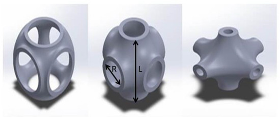Minimal surfaces have many advantages that have been widely used in tissue engineering scaffolds. For example, they can facilitate cell migration and retain the high degree of structural stiffness [34,35]. Regarding that, the Schwarz Primitive (SP) triply periodic minimal surface (Figure 3) is opted for the base structure of the prosthesis. In Figure 3, R parameter represents the radius of the SP unit cell and L stands for the length of the unit cell. It should be noted that the prosthesis is divided into 19 separated layers (See Figure 4)—first fourteen layers have the same length (5 mm), but layers 15, 16, 17, 18, and 19 have shorter length (4 mm)—that are selected from Table 2; all of the different layers are constructed by an SP unit cell with various radius value, but identical thickness. Afterwards, the characteristics of the SP unit cell are assigned to the whole layer. As can be seen in Figure 4, the radius of each layer alters from layer number 1 to 19 to build the whole structure of the porous FG prosthesis; however, the neck of the implant has similar elasticity of the non-porous Ti.