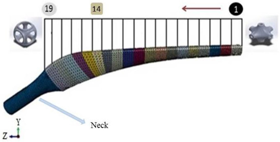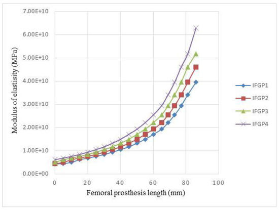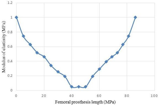 In the NFGPs, each R/L of the layers is increased from the layer number 1 to the middle of the prosthesis, but their value is decreased toward the neck and stem. The variation of elastic modulus of the layers is illustrated in Figure 18.