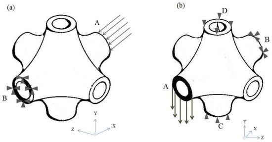 As it has been mentioned in the previous section, the prosthesis consists of layers of different unit cells. Regarding that, the mechanical properties of the unit cells are computed by the FEM. Figure 5 shows the boundary conditions of the unit cell to calculate Young and shear moduli under different conditions. In Figure 5a, the compressive load is defined in the x direction, at the cross section of A, but the opposite cross section is totally fixed at any directions. In Figure 5b, two other cross sections (C and D) are prevented to move freely in the Y direction while applying a shear loading.