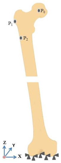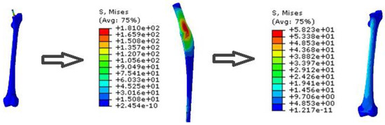 According to the previous studies, the mechanical properties of the cortical and trabecular bone are presented in Table 1 [30,31]. The cortical bone is considered a transversely isotropic elastic material, but the cancellous bone is assigned to a linear isotropic elastic material. The implant is also considered titanium alloy (Ti) with the isotropic elastic material [32]. Young’s modulus of the Ti is assumed 110 GPa [33]. In order to allocate material properties of the cortical bone, elastic properties are inserted into the FEM software and a coordinate system is set to orient the properties appropriately. The whole structures of the cortical bone, cancellous bone, and implant are illustrated in Figure 1. Table 1 shows mechanical properties of the cortical and cancellous bone.