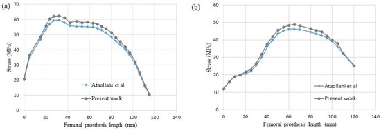 In this study, a finite element investigation is performed to find optimum porous FG prosthesis with SP unit cells. Stress distribution of the uniform prosthesis (UP) for two paths (Figure 7) is compared with Ataollahi et al. [31] (see Figure 8). The results show a good agreement between results of the present model and those of Ataollahi et al. [31] verifying the FEM accuracy. The FEM model can reduce the cost of fabrication and precisely predict the mechanical properties of the prosthesis. This method can help researchers to find the best architecture of the prosthesis as well. In the following paragraphs, mechanical properties of different FG architecture will be investigated with the developed FEM. It is worth mentioning that there are many additive manufacturing works that investigated Ti lattice structures and the effects of pore size, boundary conditions, and process parameters [37,38]. However, utilizing an SP unit cell for femur prostheses is a novel work that does not have any counterpart. In this regard, the present study is comparable with some recent research works [31,39].