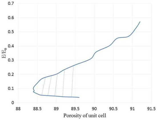 The normalized elastic modulus versus the SP unit cell’s porosity.