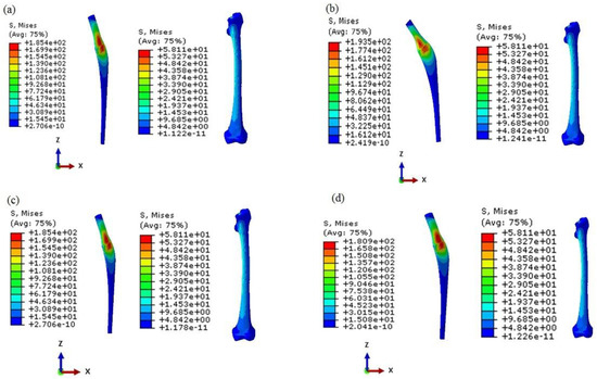 The von Mises stress distribution of the prosthesis and bone in the IFGPs: (a) IFGP1, (b) IFGP2, (c) IFGP3, (d) IFGP4.