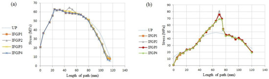 The stress distribution in two paths in the IFGPs: (a) path P1, (b) path P2.