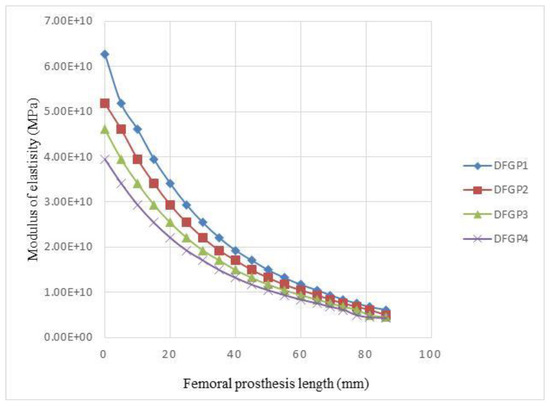 In the DFGPs, the value of R/L of the layers is decreased from layer number 1 to number 19. Four different scenarios are implemented for the DFGPs. Figure 15 illustrates the variations of the modulus of DFGPs. Figure 15, beside Figure 16, can help to find the best decreasing architecture for the prosthesis. The DFGP4 has the highest stress value, but has the lowest elastic modulus (see Figure 15). It shows that if the modulus of the elasticity is extremely lower than the elastic modulus of the neck, it will intensify the value of the maximum stress in the implant. Since the DFGP1 has a greater value of R/L, it can be more accurate than other DFGPs.