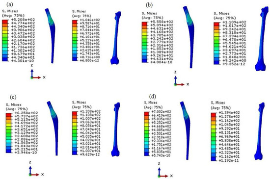 The von Mises stress distribution of prosthesis and bone in the DFGPs: (a) DFGP1, (b) DFGP2, (c) DFGP3, (d) DFGP4.