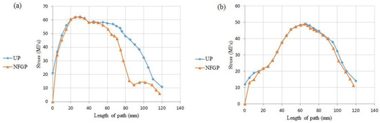 The stress distribution in two paths in the NFGP: (a) path P1, (b) path P2.