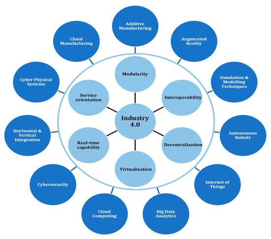 Digital transformation is characterized by the use of emerging and frequently changing digital technologies to solve specific issues. It is quickly becoming a top priority for organizations worldwide, and especially during the pandemic of COVID-19, the planning phases have accelerated significantly, as organizations can now practically assess the adverse impact of not having embedded digital technologies. The role of Industry 4.0, enabling technologies to support digital transformation, was an intensive research area before COVID-19, but this pandemic has expedited the efforts to ensure better strategies are available to realize the full benefits of Industry 4.0. The focus has shifted drastically from digitization (conversion of data to digital form) to digitalization that is focused on the ‘organizational process’ or ‘business process’ of the technologically-induced change within industries, organizations, and markets [1]. The digitalization of manufacturing industries has enabled new production processes using the key technology trends of Industry 4.0 and its design principles [2,3], as shown in Figure 1.