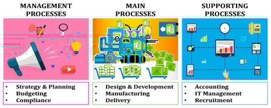 A business process is a set of related functions (and sub-functions) in a specific sequence performed by people or machinery that can deliver value to an internal or external customer. Business processes are present at all organizational levels and not all of them are visible to external customers. A business process can be represented by flowcharts showing the flow of activities. Managing business processes effectively leads to higher productivity and efficiency of the business. There are different approaches to defining the types of business processes. For example, Rosing, Von Scheel, and Scheer [132] classified business processes into main/core processes (focus on delivering value), management processes (focus on overseeing main processes), and supporting processes (focus on supporting the main processes), as shown in Figure 2. On the other hand, Kirchmer [133] showed a slight variation and classified them as operational processes (primary business processes that create value), management processes (focus on ensuring operational processes are conducted correctly), and governance processes (ensure compliance with legal guidelines).