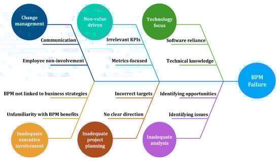 Cause and effect diagram for the failure of business process management (BPM) initiatives.