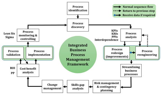 The smooth running of business processes is essential for a successful business. In that context, two business management strategies are quite popular, i.e., business process reengineering (BPR) and business process management (BPM). BPR was introduced in the early 1990s and aimed to help organizations fundamentally rethink the workflow of their business processes and incorporate radical changes to increase their efficiency and productivity, improve customer service, and reduce operational costs [134,135]. Despite the number of definitions in the literature, some shared elements can be identified, e.g., radical change, dramatic performance improvements, high potential business benefits, process-based organizations, customer orientation, information technology as an enabler, rapid pace of change, and high risks [136,137]. This approach provided some benefits, but was faced with criticism because of its inability to validate its assumptions. For example, it assumes that the ineffectiveness of an organization stems from its business processes, but does not offer any means of validating that. Furthermore, the focus on always making a radical change and completely disregarding the existing process can have serious consequences. BPR was implemented with an ulterior motive in the 1990s, with organizations viewing it as a means of formally downsizing and laying-off employees to remain competitive in the market [138]. BPR was not aimed at only radical changes, but can incorporate incremental improvements as well, depending on the nature of the problem at hand [139]. The methodology is still being used with good effect; even aiding digital transformation as IT (information technology) is considered as one of its key enablers. Qu, et al. [140] used BPR to strategically enhance the adaptability and functional integrity of an enterprise information system, to meet the demands of smart manufacturing systems.