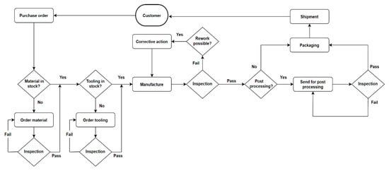 The second phase involves the identification of the business process to be improved or reengineered. It involves characterizing and establishing the boundary and interfaces of the different business processes with each other and understanding their connection. For example, the business process to be improved/reengineered could be the main process, such as manufacturing, or a supporting process such as accounting (Section 4). A simple flow chart showing the connections between the main and supporting processes is shown in Figure 7. It is crucial to develop a visual representation of the identified process with a proper and realistic breakdown of sub-processes. At this stage, it would be tempting to develop a layout that shows what the process should be, but it must be drawn as ‘it-is’ (or ‘as-is’) to ensure that the shortcomings could be captured and appropriate actions could be taken. There are different ways the flow of activities for a specific business process could be recorded. It could be done by creating simple flow charts, either manually or by the use of simple software tools such as LucidChart, Microsoft Visio, and Creately [208]. These software packages work on business process modelling notation (BPMN), which is a standard method to model the steps of a planned business process from end to end [209]. A critical aspect of the ‘as-is’ process flow chart is the accuracy of the information, connections, sequence flows, and decision points. Value stream mapping is also a useful tool that displays the steps in a specific business process and shows the flow of both materials and information as they progress through the process to the end-user [210]. The purpose is to form an ‘as-is’ process model that provides a common understanding and communication among the stakeholders. This will help the IBPM team to assess the process flow and its shortcomings, to develop innovative solutions.