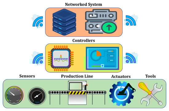 Considering that there are two options to contend, it is crucial to understand the implications of both. For the redesign, there is an implied acceptance of the current processes. Therefore, the main focus of the IBPM team would be to use the results from Phase 3 and incrementally devise solutions for those issues, taking one issue at a time. These issues could stem from performance indicators, risks, or interdependence studies. For example, if the process to be redesigned is a manufacturing process, as shown in Figure 8, comprising sensors, tools, actuators, controllers, and networked systems [228], then the incremental improvements would involve strategically adding Industry 4.0 enabling technologies, to ensure optimal performance. The addition of BDA will help in predictive modelling to support decision making that can be utilized for ingesting and integrating copious amounts of data from the production floor [229], leading to better production or maintenance planning. However, these incremental changes should be guided by Industry 4.0 design principles (Section 3), as they will support the IBPM team in identifying and implementing Industry 4.0 scenarios for enhanced performance.