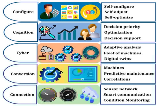 Techniques and levels of the 5C (connection, conversion, cyber, cognition, and configuration) architecture for cyber-physical systems (CPS).