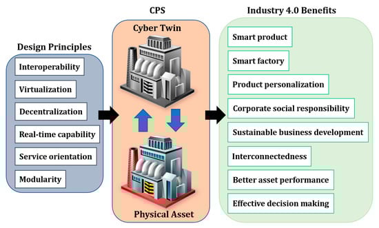 This design principle refers to two different scenarios. First is the case where one virtual resource is created from multiple physical resources, and in the second scenario, many virtual resources are created from one or more physical resources. In the former, the physical assets are simulated through the development of component and system-based digital twins or CPS [117]. In the latter, the software is used to divide one physical server into multiple virtual servers that act like unique physical devices. Digital twins can serve a variety of purposes, e.g., performance optimization, visualizing different scenarios, and real-time control. This provides the benefits of extending equipment life, identifying system inefficiencies, and reducing operational, as well as maintenance, costs [118,119]. CPS also allows the same opportunities by collating sensor data, analysis, and decision making through the use of decentralized control circuits [120]. Besides, virtual reality (VR) has also proven to be a useful tool for workforce training, improving their performance, guiding maintenance, and assembly tasks [121,122]. A combination of VR and AR with mobile devices provides stakeholders (employees and customers) with more insight into the detailed design of products and allows better process tracking [123,124,125]. Virtualization enables virtual system building, factory data virtualization, virtual modelling language, and virtual interfacing with digital twins as well as CPS [101].