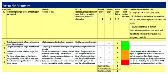 Even though KRIs have been identified in Phase 3 and then reviewed based on the ‘to-be’ process, there is a need to incorporate risk management and contingency planning as a precursor to the next phases. Industry 4.0 builds complex, dynamic, and real-time connections between humans and systems for enhanced performance. These activities generate large data volumes in real-time, which causes new requirements of the infrastructure, management, and technologies. This could be viewed as more reasons to worry and more things that can go wrong than ever before [173,174,175,176,177]. The IBPM team should incorporate methods of avoiding, mitigating, transferring, and accepting risks. Risk intelligence is needed to collate information, to identify, assess, and treat risks [178,179,231]. Risks can be identified through brainstorming (group activity for the generation of a large number of ideas), premortem (imagining failure and listing the probable reasons), or counterfactual thinking (evaluating choices that were not made). A risk analysis can be done through developing a risk register, that includes evaluating risk probability and its impact. It is common practice for any new project to develop a risk register that quantifies the risk in terms of probability and impact followed by mitigation plans. The IBPM team should make use of this approach and record the probability and impact of their activities towards digital transformation. A sample risk assessment is shown in Figure 12 for Industry 4.0 implementation. The IBPM team should employ systems thinking approach that allows envisioning broad end-to-end impacts. For example, a cascading failure starts small, but becomes large with time and spreads across a system as a chain reaction of interconnected parts. Industry 4.0 is all about interconnectedness, therefore, the IBPM team must consider such failure modes as well [232]. Risk management includes steps before a risk occurs, whereas contingency planning focuses on steps to be taken if, or when, a risk occurs [233]. Both are crucial to maintaining and mitigating risks to the business. One major aspect of mitigating risks is knowing what to do when a risk occurs. This means that contingency planning can be considered as a component of risk management. Since the organization is moving in an unfamiliar direction with Industry 4.0, it is necessary to develop contingency plans for the identified and common risks (e.g., natural disaster or data losses) and communicate them to the employees.