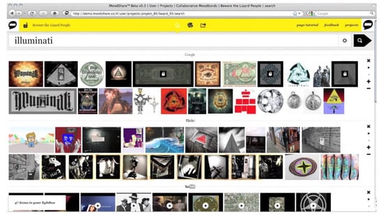 The MoodShare image board Internet platform is fitted with a drawing function such as the “MoodShare image board Internet platform” (MoodShare, 2019), and search engine linking sources of pictures and video films from such websites as Twitter, Google, Bing, Flickr, Picasa, BigStock, ShutterStock, Youtube, Vimeo, and ColorLovers, etc. Pictures are mainly obtained by entering key nouns or pronouns. For example, by entering the key word “wave”, a user can find pictures and videos related to wave, and can quickly drag images, videos, sounds, and color palettes within a few seconds to create an image board (as shown in Figure 3). The picture collection of this platform is based on the picture classification of the individual major websites (mostly by key words), however, users have no idea about how the pictures have been classified, and therefore have difficulty obtaining pictures that are relevant to an ideal image of their target users. Moreover, the pictures are retrieved in this system by entering a noun or pronoun rather than entering the relevant adjective of a desired image, and the obtained output is multifarious and messy. If these pictures are directly used to make an image board, it is impossible to determine if they meet the image that users pursue. Although we can position and group these pictures before using them to make an image board, it is as time-consuming and labor-intensive as using the traditional image board method. A discussion related to the experience of using these three web pages related to the image board has been provided by users who have used the platform. According to the users’ experiences, the pictures have not been tested, and it is sometimes not easy to find pictures that meet their expectations.