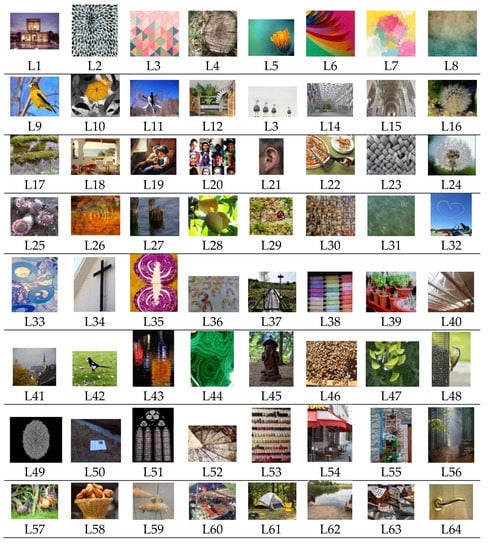 There were two methods used to collect the pictures of the LOHAS image. First, the 16 LOHAS representatives were asked to extensively collect pictures, for one week, mainly about food, clothing, residence, travel, education, and recreation related to LOHAS. There were no limitations set on the number of pictures and a total of 325 pictures were collected. Another 5 LOHAS representatives were invited to review and discuss the relevance of these pictures for expressing the LOHAS image via cloud video conference. On the basis of a consensus, 50 pictures were selected for the database. Secondly, since image boards are mostly built and used by designers, in order to include designers’ views in the picture database, 14 designers with more than 1 year of design experience were also invited to, first, collect many pictures relevant to LOHAS and product design. There were no limitations set on the number of pictures collected. The collection lasted one week with a total of 200 pictures collected. Another five designers with more than 5 years of design experience were invited to reduce the quantity of the pictures also via cloud video conference. On the basis of a consensus, 16 pictures were finally selected. Following these two methods, a total of 66 pictures, as shown in Figure 4, were proposed for the picture database and served as the stimuli for the SD assessment.
