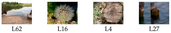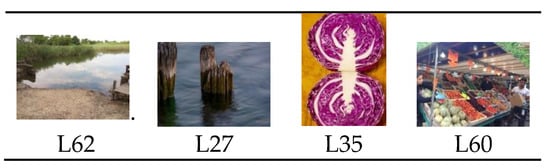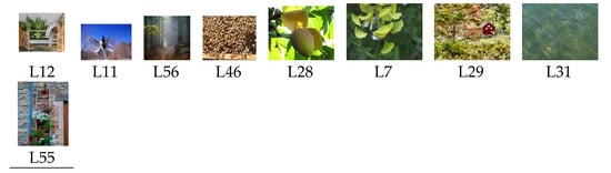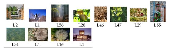 Again, two criteria were adopted to recommend relevant pictures based on the results of the GRA. The first criterion is the grey relational grade (Column 9 in Table 3) of a picture higher than 0.8 and there are 13 pictures that meet the criterion including L12, L11, L56, L46, L28, L47, L29, L31, L55, L62, L16, L4, and L27 in order of grey relational grade, as is shown in Figure 7 and Figure 8. The second criterion is pictures with the total number of grey relational coefficients of adjectives higher than 0.8 (shown in Column 10 of Table 3) equal to 6 (all grey relational coefficients of adjectives >0.8) and there are nine pictures that meet the criterion including L12, L11, L6, L46, L28, L47, L29, L31, and L55 in order of grey relational grade, as shown in Figure 7. The nine pictures screened by the second criterion certainly also meet the first criterion, thus, they are regarded as the most recommended pictures for the LOHAS image, here. The other four pictures including L62, L16, L4, and L27, as shown in Figure 8, only meet the first criterion but not the second one, are regarded as recommended pictures for the LOHAS image.