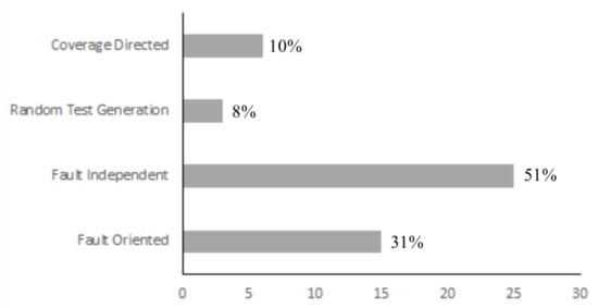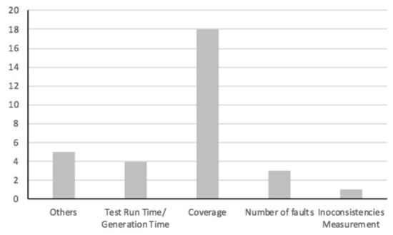 Figure 8, 18 studies use test coverage as a proxy metric for effectiveness. Other four studies used both generation and execution time as a measure of test efficiency. Fault detection capability has been used in three studies as a proxy measure of effectiveness. It seems that coverage criteria is the most common metric used for test suite evaluation. Rao et al. [