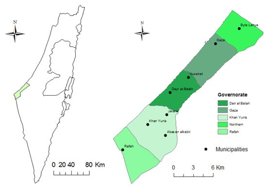 The GS is situated at the eastern shore of the Mediterranean in the southern part of the Palestinian coast. It has a length of 45 km and a width varying between 6 and 12 km from north to south. Egypt lies by the Palestinian Territories (1948) from the east and north. The GS lies 34.13°–34.34° E and 31.13°–31.35° N in the geographical position. The annual incident solar insolation on GS is approximately 5.904 kWh/m2 day [15], with an area of 356 km2, or 1% of the total area of Palestine with about 1,899,291 inhabitants, considered to be one of the most populated areas with a population density of 5335 persons/km2 according to Palestinian Central Bureau of Statistics (PCBS, 2019). The GS consists of five Governorates: Northern Gaza, Gaza, Deir al-Balah, Khan Younis, and Rafah (Figure 2) and it is divided into major towns, villages, and refugee camps [20]. The general unemployment rate in the GS is considered high, with a labor force rate of 23.4 percent. On the GS market, temporary modes of employment dominate. Most jobs are characterized by daily wages and short-term contracts; the largest portion of the population works in the services sector and other branches. Economic reports have shown that this sector has begun to grow in the GS over the past few years, while 6.4% are working in agriculture, hunting, and fishing activities. The level of literacy in the GS is generally high, amounting to 95% of the population over the age of 15. Gender discrepancy is not significant except in the groups above 45 years of age. The population educated to Bachelor’s level and above is 11.2% [23]. However, 48.2% of this population is economically inactive, involving a major economic issue. The average household size in GS is between 5 and 6 individuals, and the number of families exceeds 334,710 families; one-third of them lived in Gaza governorate alone. In 2015, nearly all of households connected to the public grid [20].