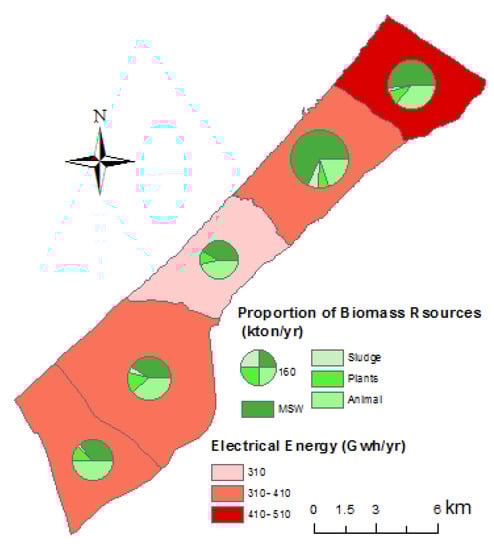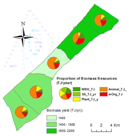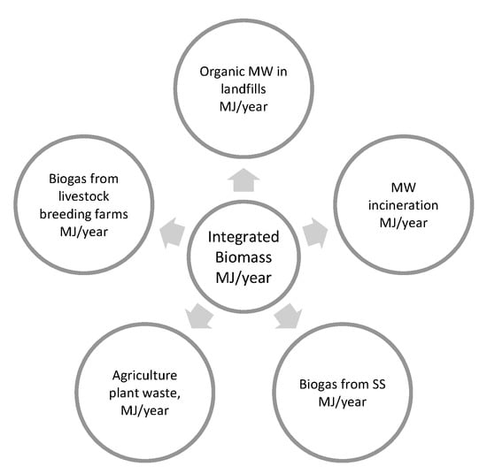 The potential energy derived from biomass was assessed using Equation (6). The method suggests anaerobic digestion, but combustion will be carried out on non-organic MSW, Figure 3 shows the incorporated energy (MJ/year) from the different biomass sources in the work area. It is good noting digested animal organic waste after biochemical treatment can be used as compost.