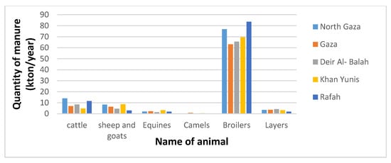 Production of animal waste in Gaza comes from sheep, goats, camels, cattle, calves, and poultry. Types of poultry in the study area are broilers, layers, broilers mothers, turkey, and rabbits. Broilers refers to the chicks which can be kept to produce white meat with 50 days as a maximum period. Layers refers to the chicks kept to produce table eggs, typically not longer than 30 months in life span. Based on methane yields obtained, the amount of methane from livestock units was evaluated and implies anaerobic digestion [37]. The density of veal, ovine, and poultry manure is 103, 103, and 970 kg/m3, respectively [35]. The total volume of methane in the animal waste and the energy yield was determined using Equation (5).