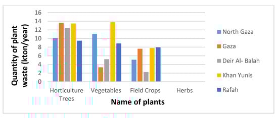 Agricultural land is about 16,400 ha, according to the MoA annual report 2013–2014, classified into 5600 ha vegetables, 8000 ha garden trees, 2800 ha field crops, and 20.8 ha as herbs [33]. On the other side, the production of agricultural waste is around 1197 tons of organic waste per day. Research in [34] obtained the amount of methane released by anaerobic digestion of vegetable and fruit waste, the total amount of methane produced from garden trees was calculated according to [35] method, the biogas can be produced from crop could be evaluated by referring to [35], and finally, the amount of methane in herbalists was obtained from Letomaki [36]. Using Equation (4) the methane generated from anaerobic digestion can be detected for agricultural land and its energy production.